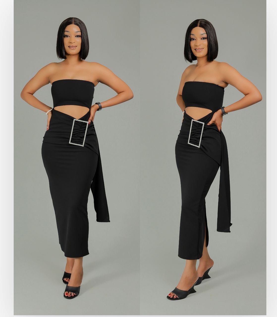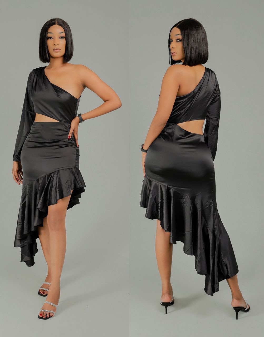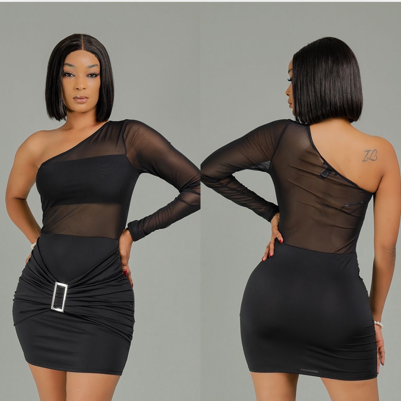 Robe une manche avec ceinture argentée